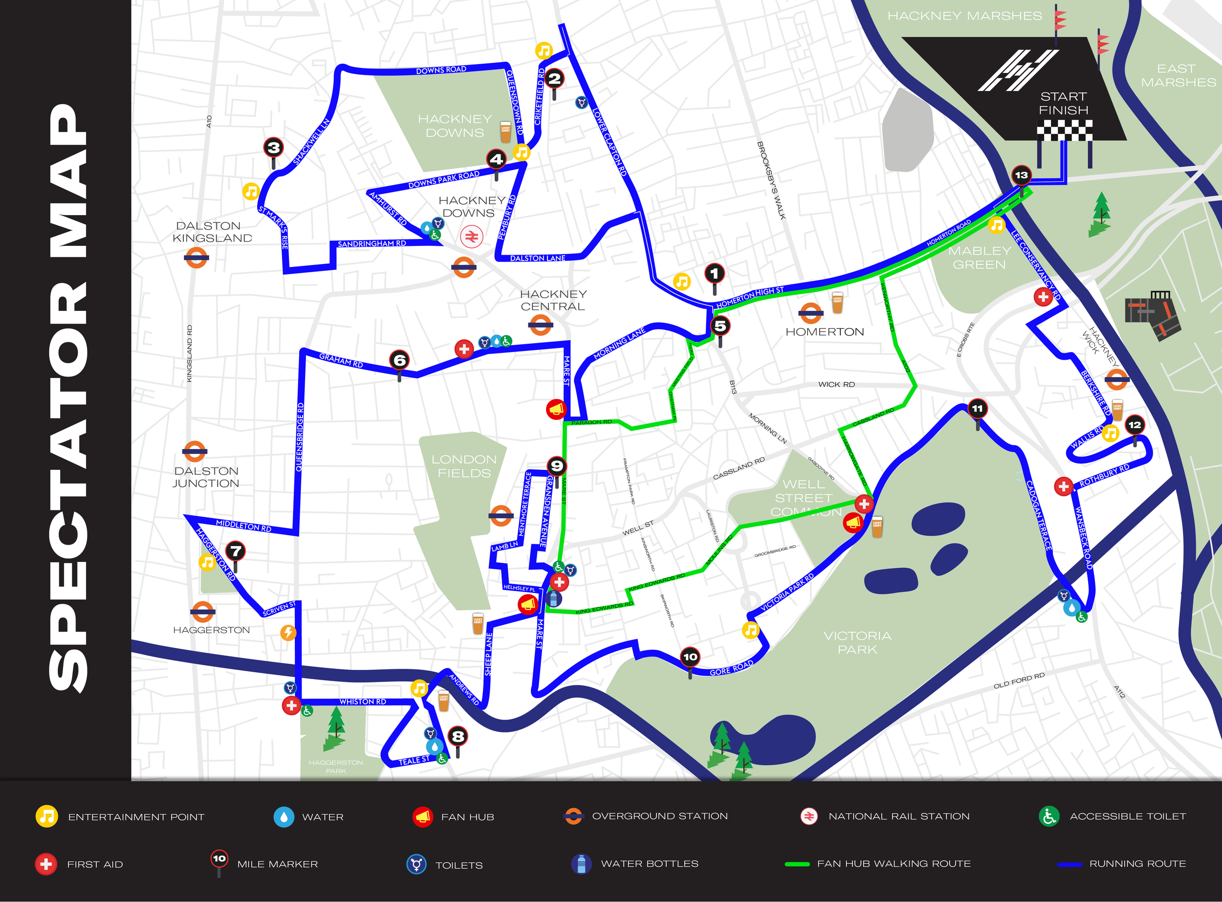 The Festival Village in the southern end of Hackney Marshes will be open from 07:00 and is the prime spot for seeing the race start and finish. Or why not follow the Fan Hub walking route – you’ll be able to walk between each one faster than your runner, so you’ll get to see them whizz past you more than once.